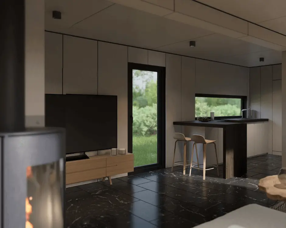 Izbaudiet pārdomātu un ilgtspējīgu dizainu mūsu rūpīgi veidotajā metāla karkasa mājā OLIVIA! Mājoklis piedāvā daudzpusīgu plānojumu – mājīga guļamistaba, iedvesmojošs kabinets (ko var izmantot kā otro guļamistabu) un plaša dzīvojamā zona, kas apvienota ar virtuvi un ēdamistabu.